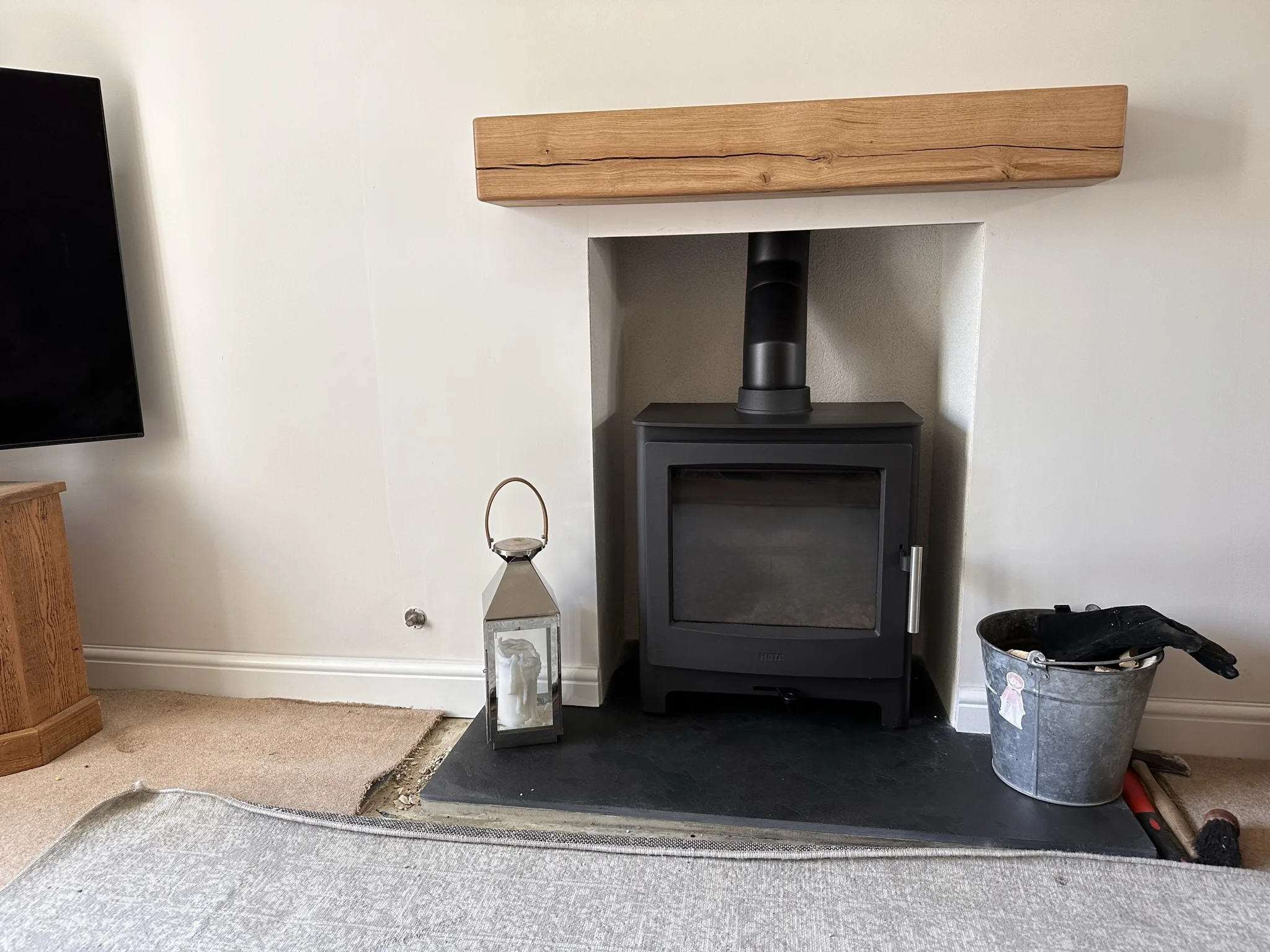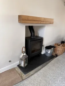 The modern Heta Ambition5 installed in this firepalced, witha black brazilian slate hearth adn rendered interior, finished off with a real oak beam.